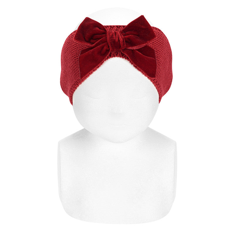 Fascia per capelli lavorata a maglia con grande fiocco in velluto abbinato.