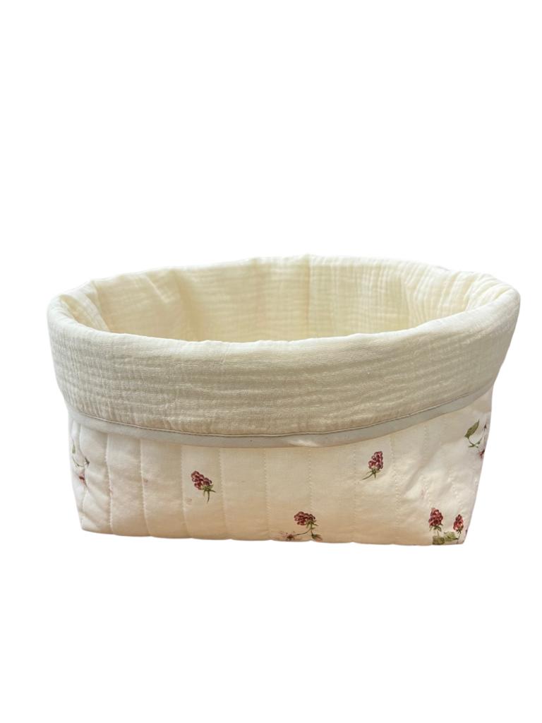 Cestino/contenitore trapuntato a doppia faccia per riporre accessori, inclusi cosmetici per bambini o pannolini. Il cesto è realizzato in due tessuti: il lato esterno è in cotone satinato trapuntato. La sua trama lo rende delicato e liscio al tatto. Anche l'interno è in cotone, ma in questo caso non trapuntato. Il contenitore può essere arrotolato ovunque , a tua discrezione. Il cesto aiuterà a organizzare lo spazio accanto al fasciatoio , completerà anche la decorazione interna .