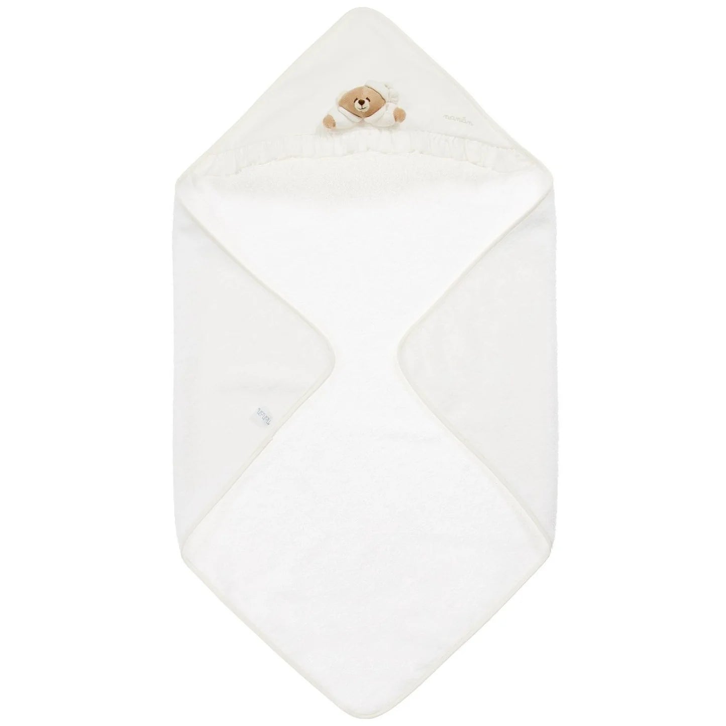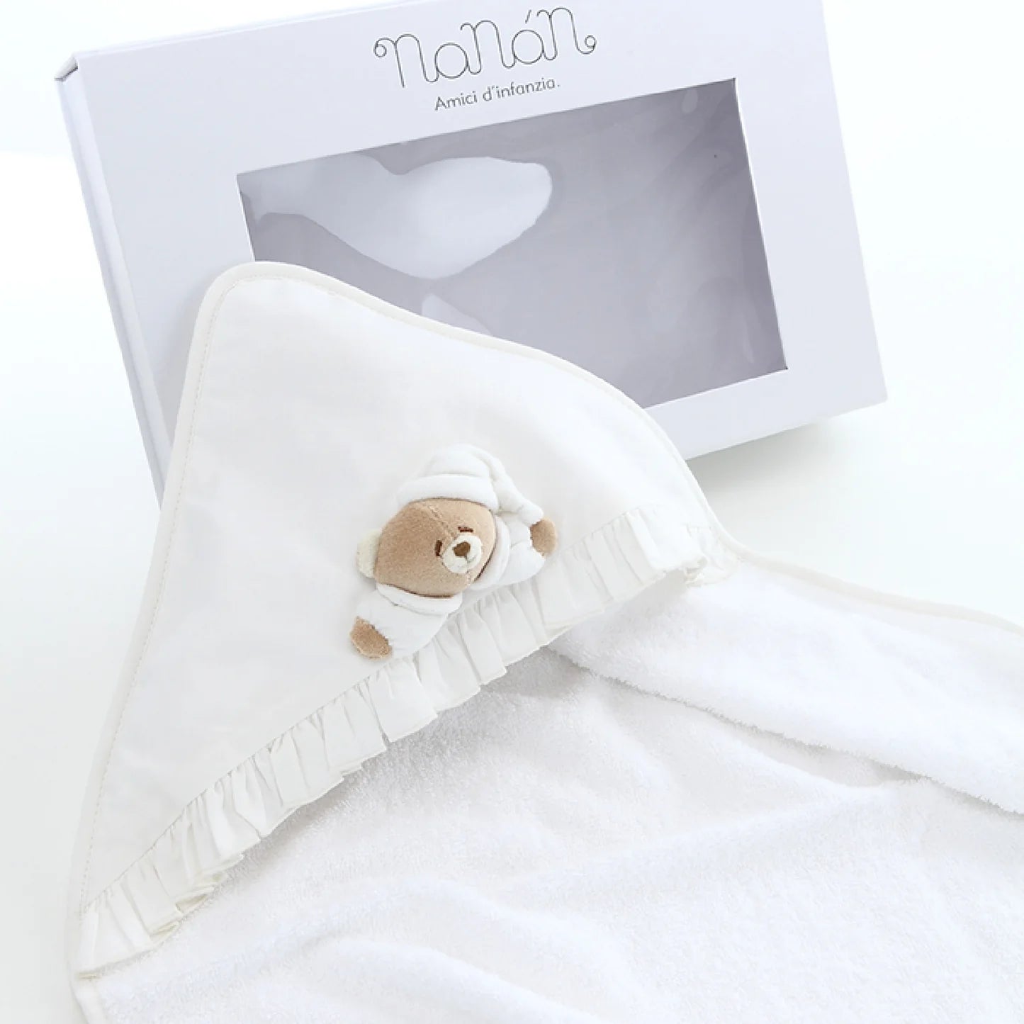 L'accappatoio nascita della collezione Tato è l'ideale per il bambino appena nato. Comodo e indispensabile nel momento quotidiano del bagnetto, è utile per avvolgere completamente il bambino dopo il bagno, circondandolo con morbida spugna di cotone. Il cappuccio è ricoperto con morbido cotone e decorato con l'applicazione dell'orso Tato e con una romantica balza. Gli amici d'infanzia avvolgono di tenerezza e divertimento ogni momento della giornata del tuo bebè! Dimensioni: 72x72cm