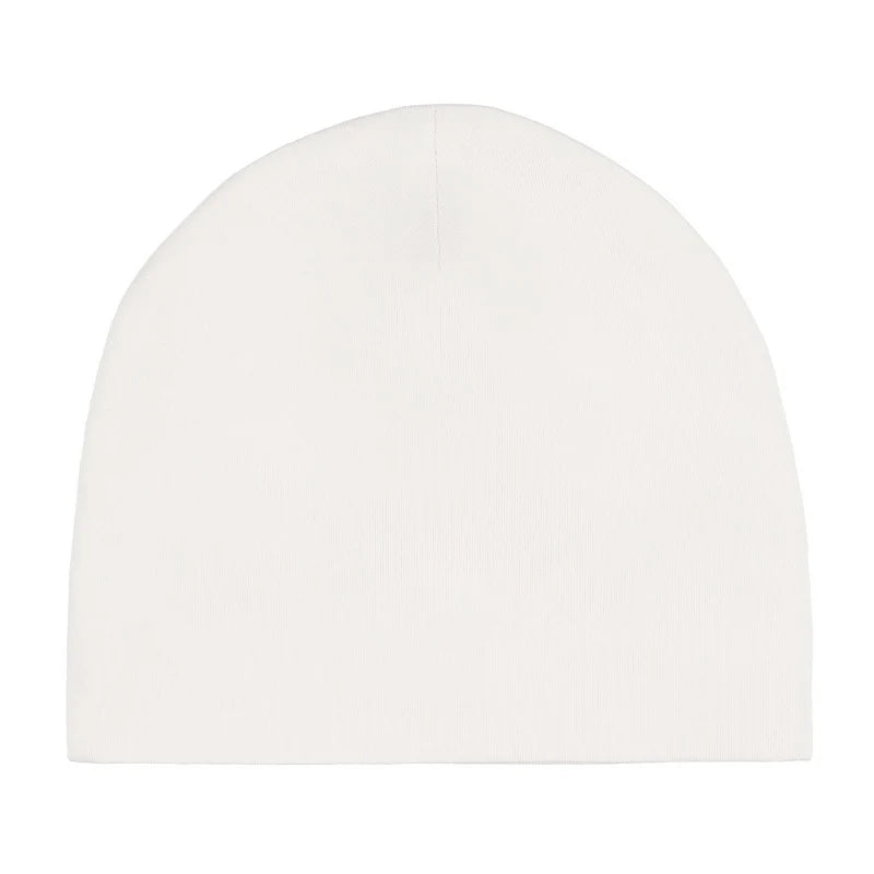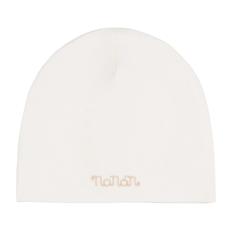 Cappello bianco con ricamo tono su tono. Un dettaglio elegante, pensato per completare con delicatezza i primi outfit.