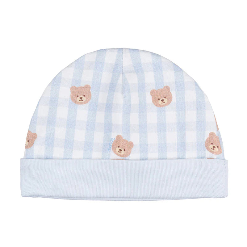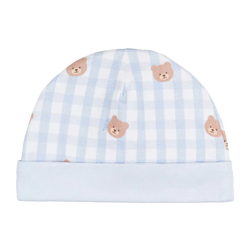 Cappello con tenera fantasia di orsetti allover. Un dettaglio delicato e confortevole, perfetto per completare i primi outfit con stile.