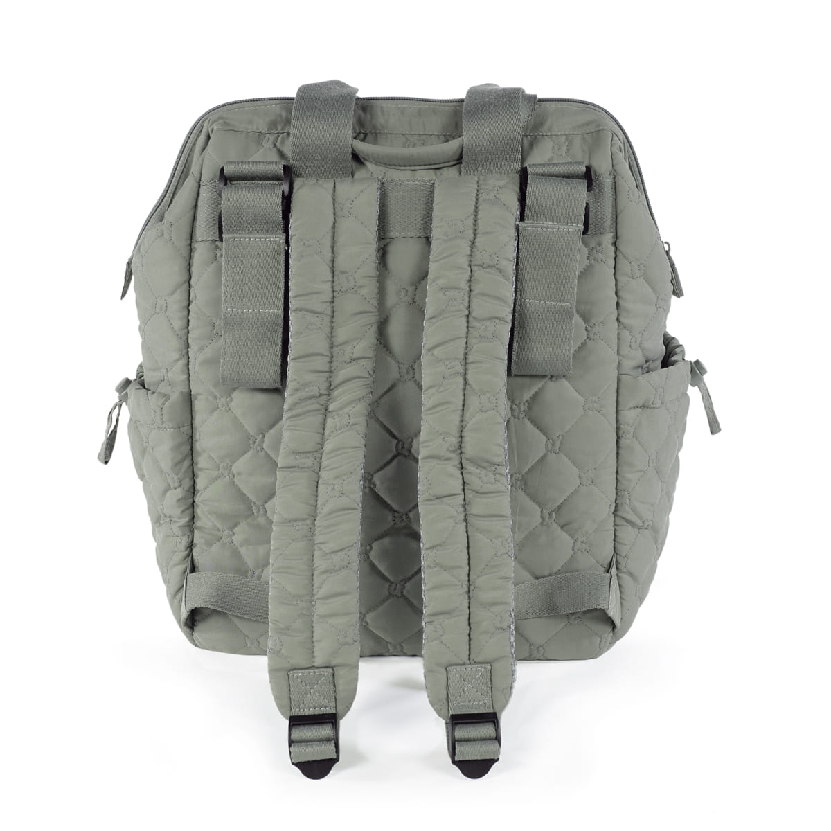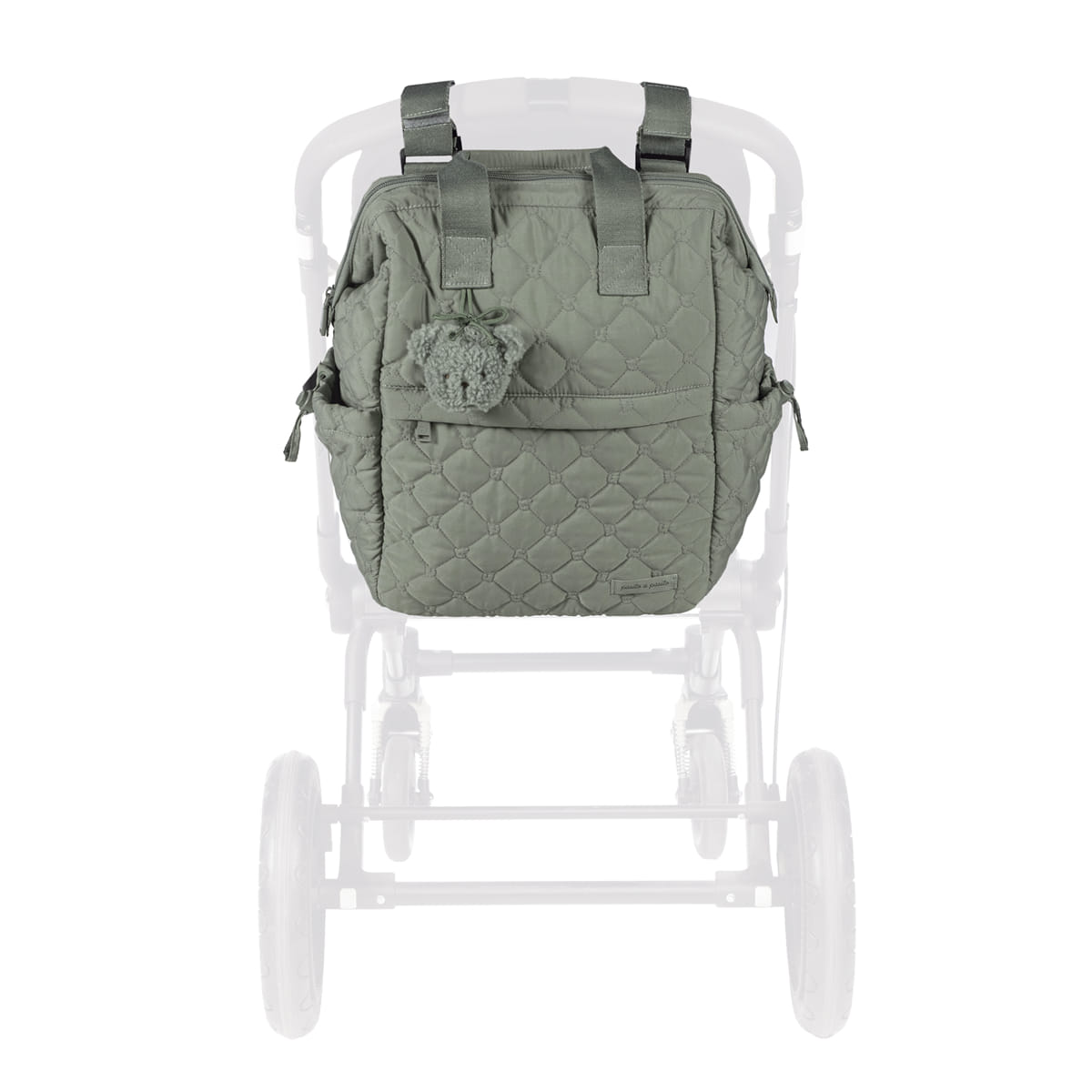 Lo zaino è progettato per la massima comodità, con due grandi spallacci regolabili per indossarlo comodamente sulla schiena, manici per il trasporto a mano e due piccole cinghie per un facile aggancio al passeggino. È incluso anche un materassino per il cambio, per gestire ogni situazione con praticità.