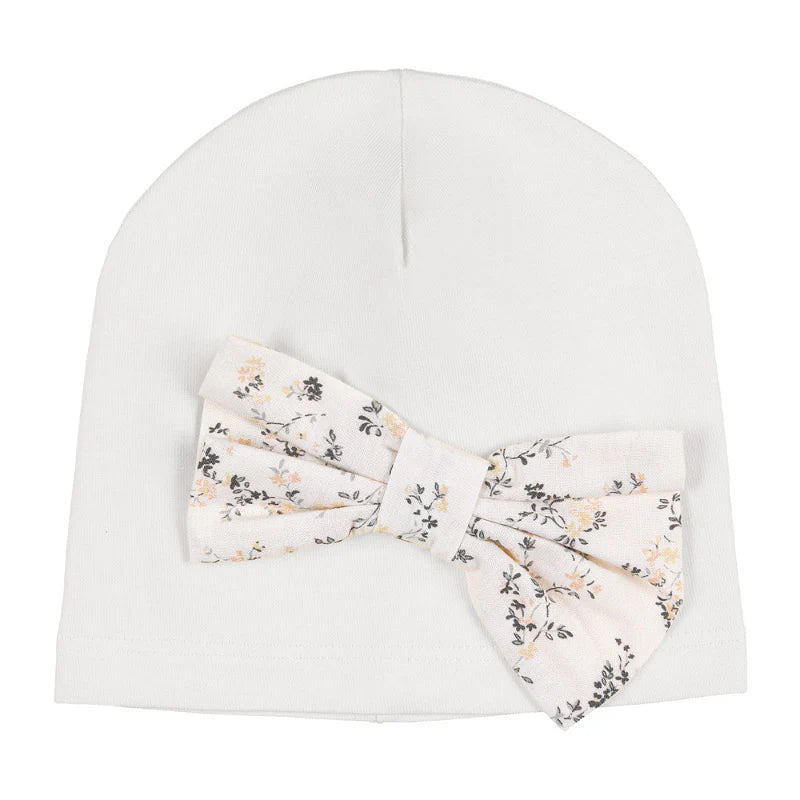 Berretta in morbido jersey, impreziosita da un delicato fiocco applicato in tessuto fiorato. Un accessorio dolce e confortevole.