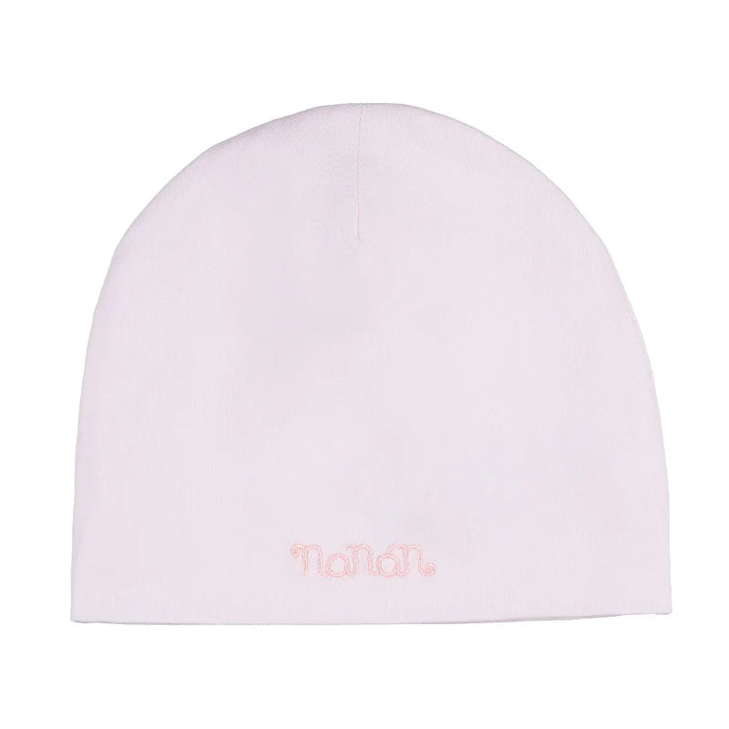 Cappello rosa con ricamo tono su tono. Un dettaglio elegante, pensato per completare con delicatezza i primi outfit.