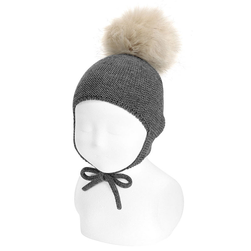 Cappello da neonato in maglia di lana e pompon. Molto caldo. Con paraorecchie e cinturino in maglia da annodare sotto il mento.