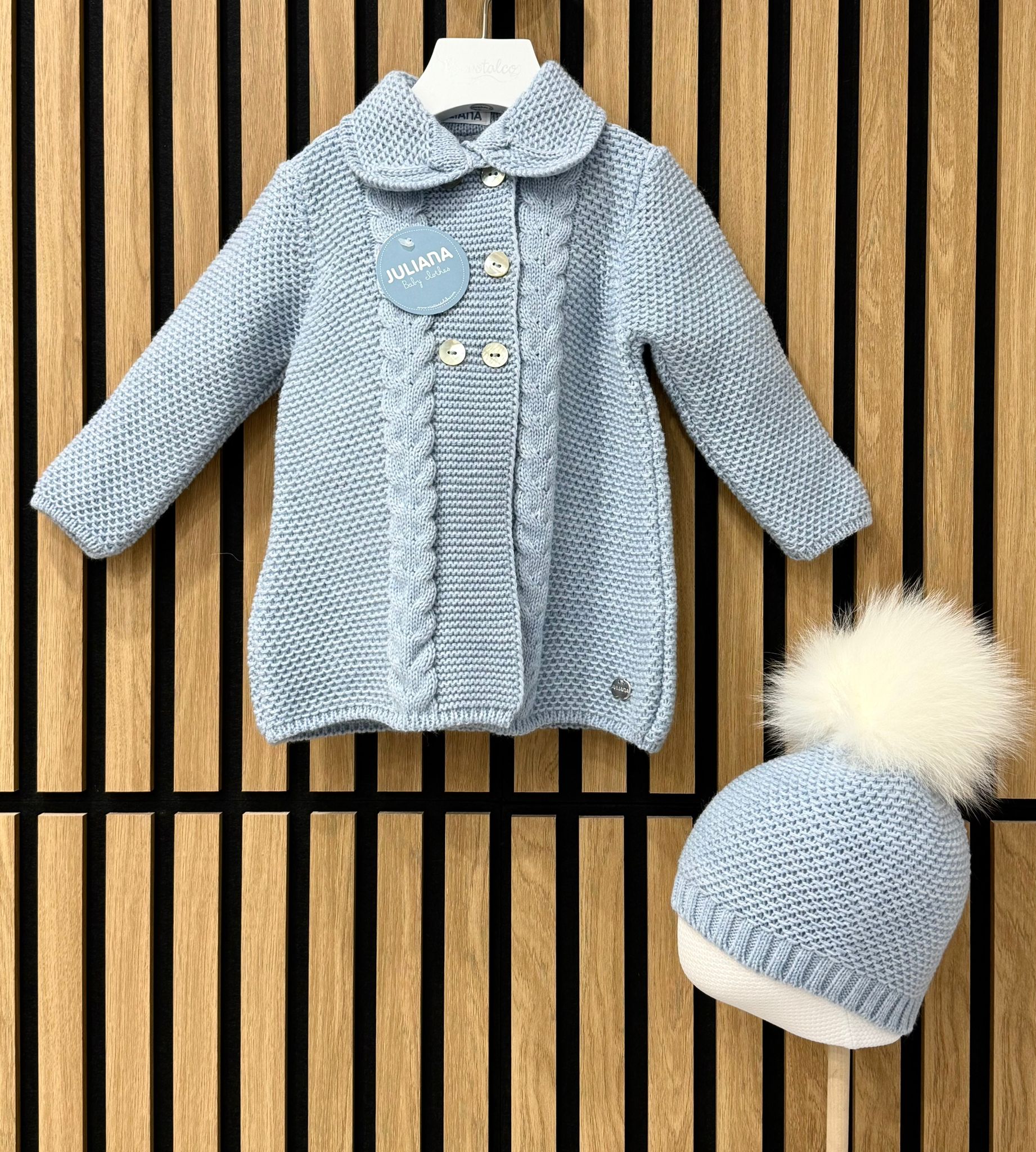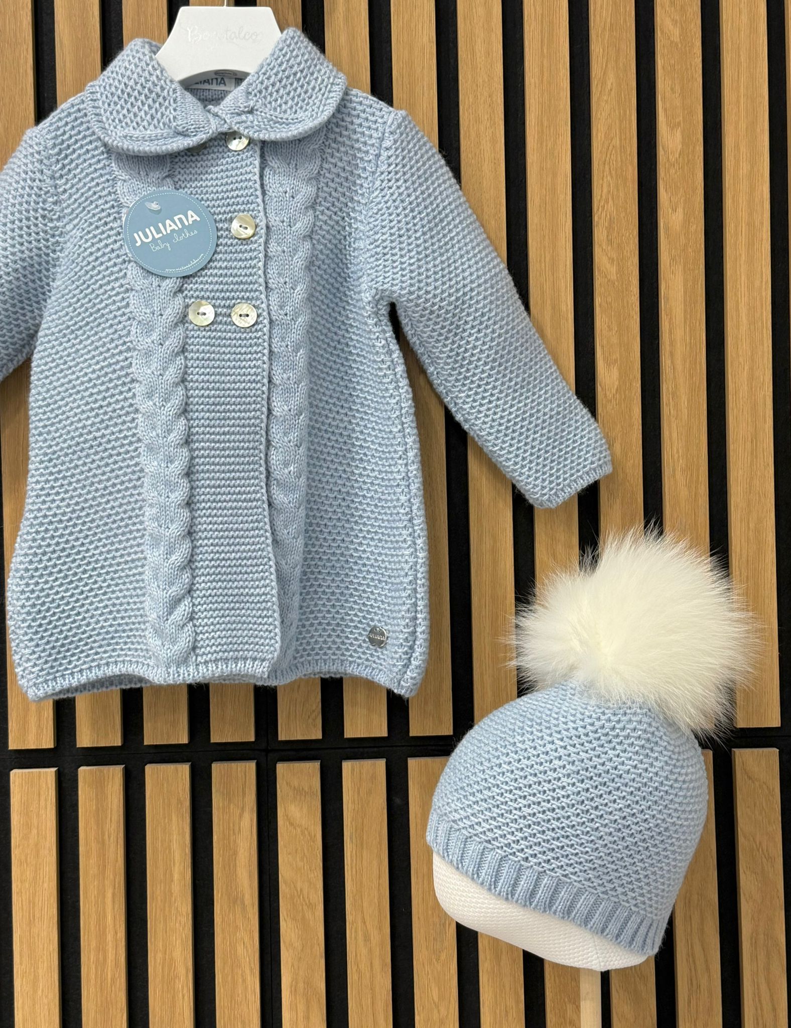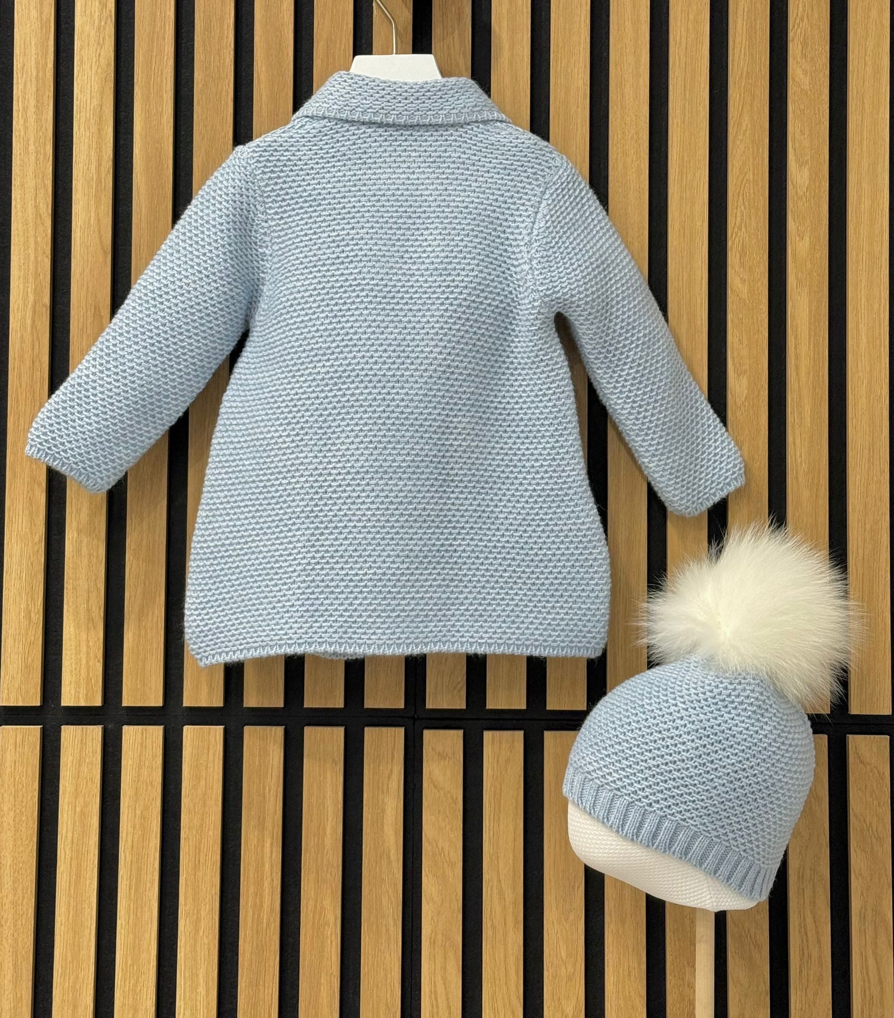 Cappotto in misto lana con bottoni in madreperla e cappello con pompon