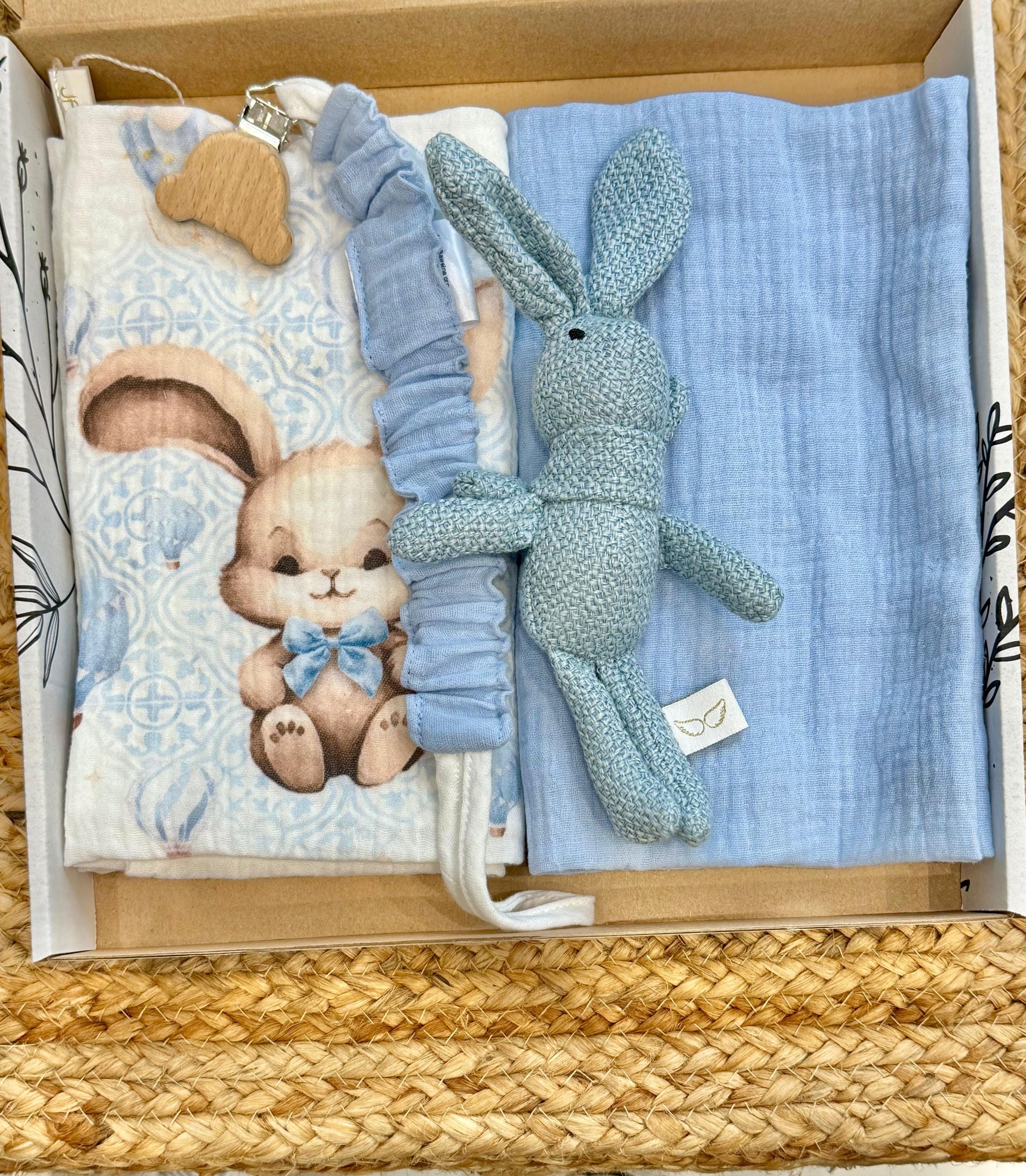 set con 2 mussole 65x65 , catenica per ciuccio e peluche