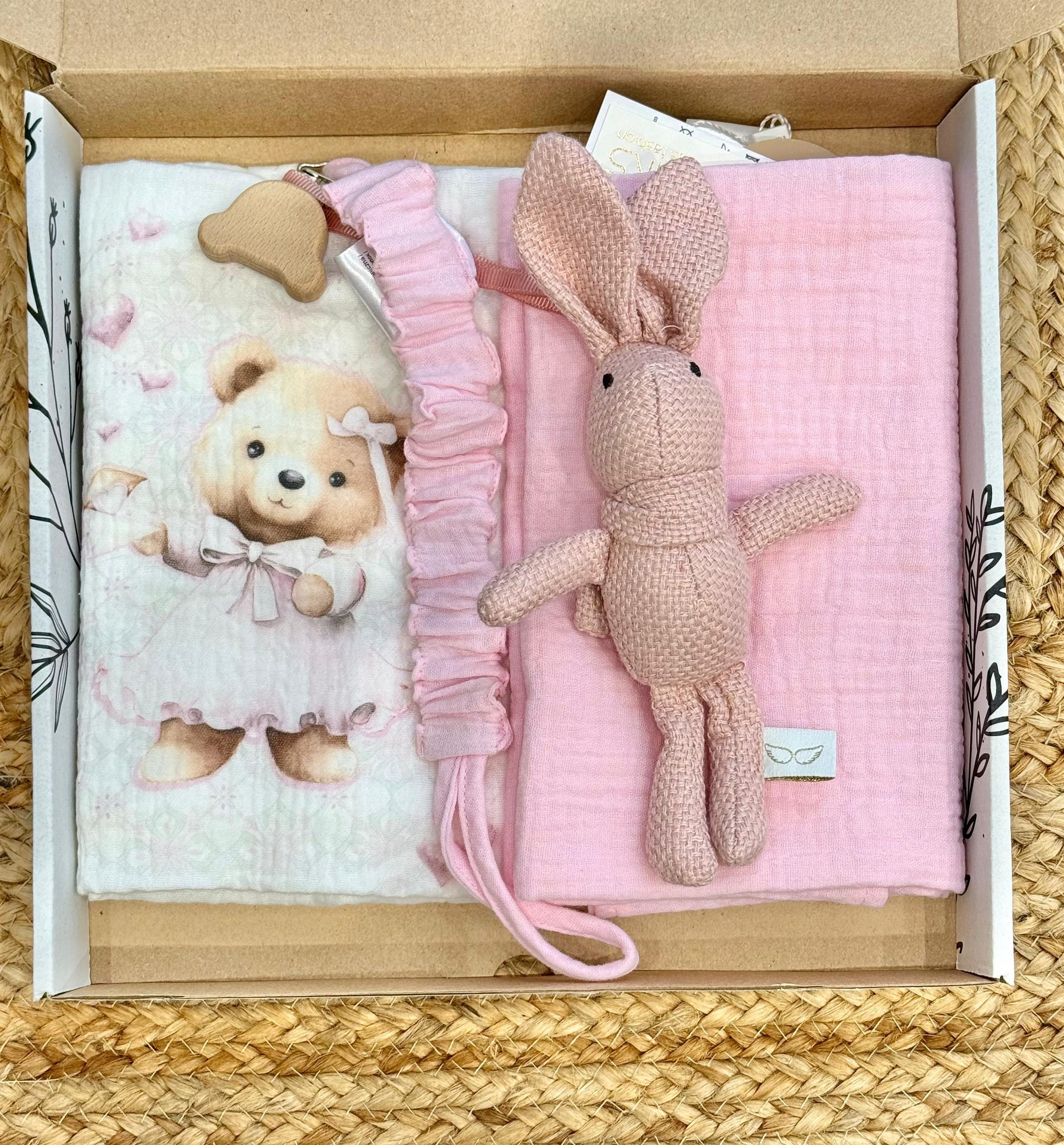 set con 2 mussole 65x65 , catenica per ciuccio e peluche