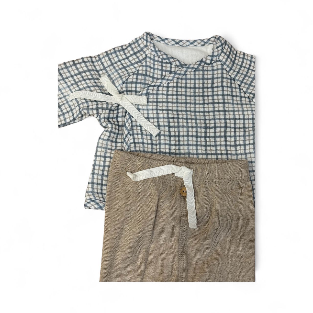 Set due pezzi in 100% cotone. Maglia in mussola stampata con calda fodera in jersey di cotone. Chiusura incrociata con nastro all'esterno e clip all'interno. Pantalone con piedini in jersey di cotone, nastro e bottone decorativo in vita.