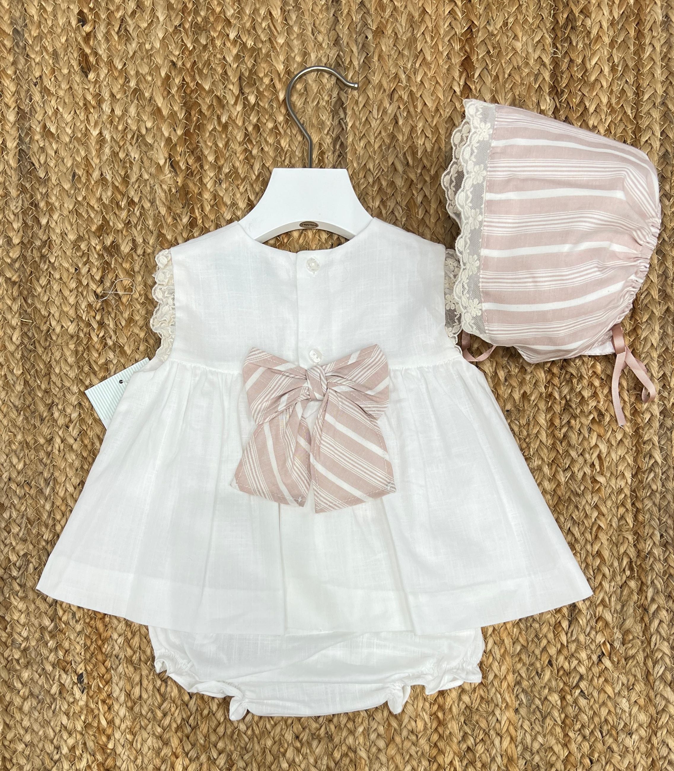 Completo con blusa e copripannolino e cuffia in cotone con merletto