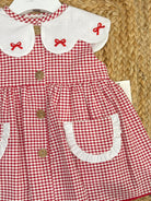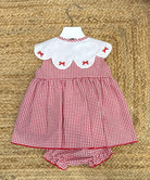 Completo con copripannolino con chiusura anteriore con bottoni in legno naturale, con fiocchi ricamati sul colletto