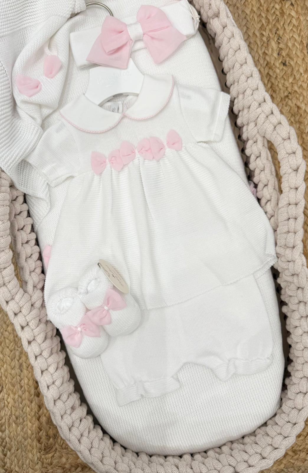 Coordinato con fascia, babbucce e scialle con fiocco in organza