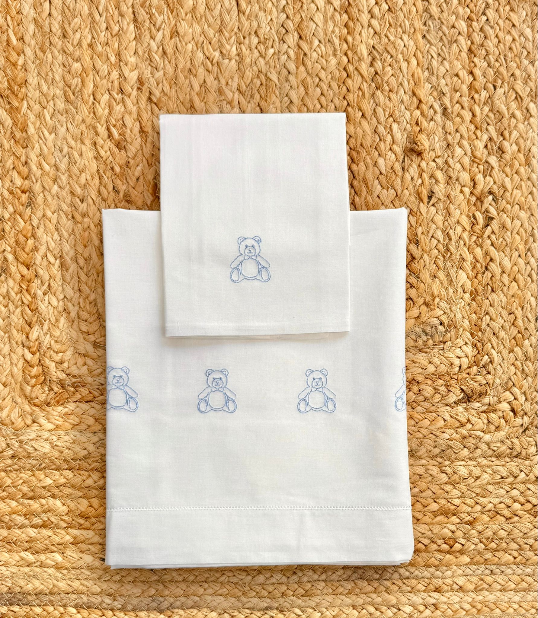 Il set lenzuola e adatto sia per culla piccola che per carrozzina è formato da: federa per cuscino e lenzuolino. Il lenzuolino è impreziosito da ricami. Il set ha una composizione di puro cotone 100%. Misura:90x120cm