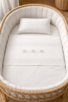 Il set lenzuola Lettino è formato da: federa per cuscino, fodera per materasso e lenzuolino. Il lenzuolino è impreziosito da ricami. Il set ha una composizione di puro cotone 100%. Misura:120x180cm