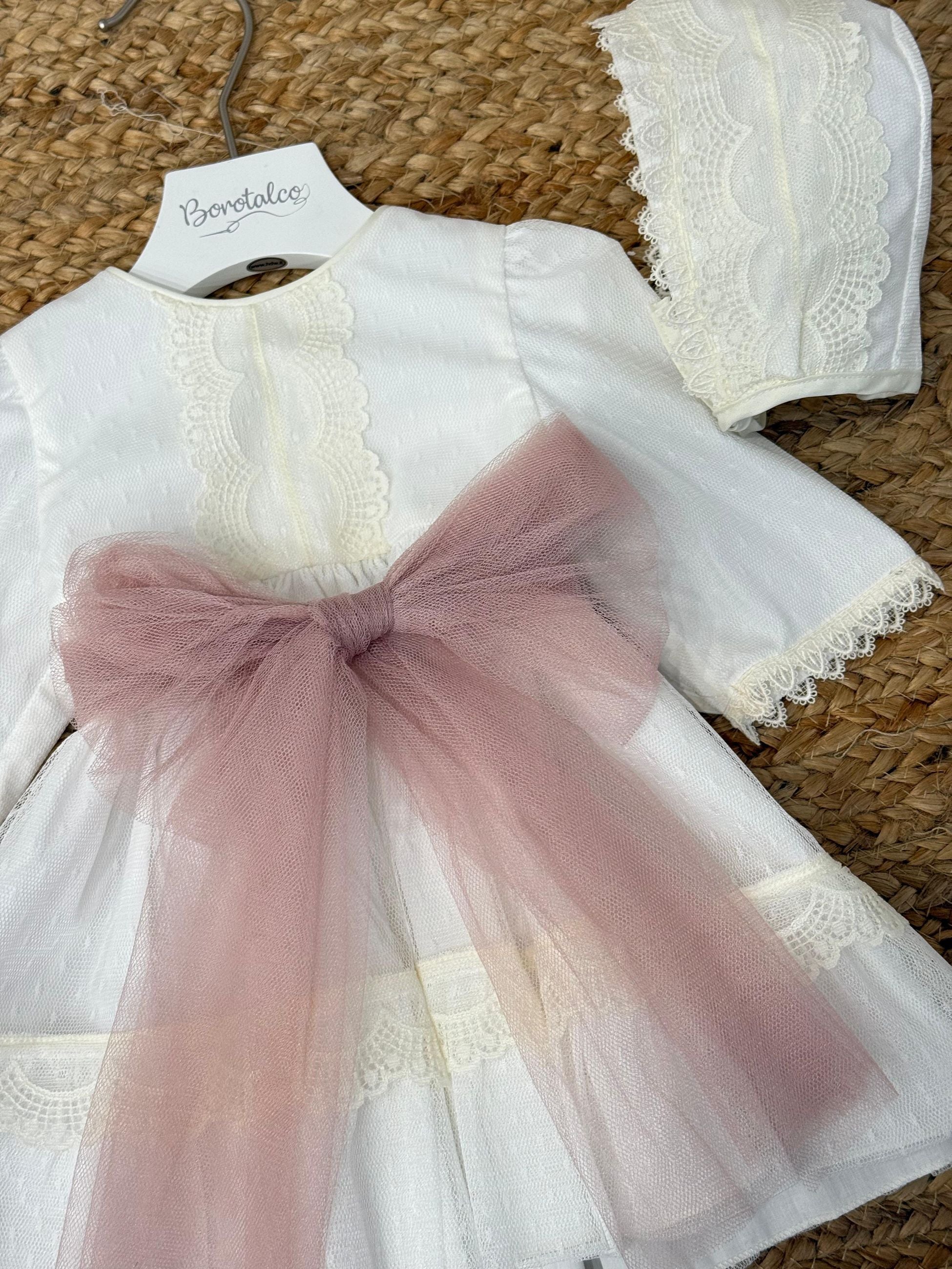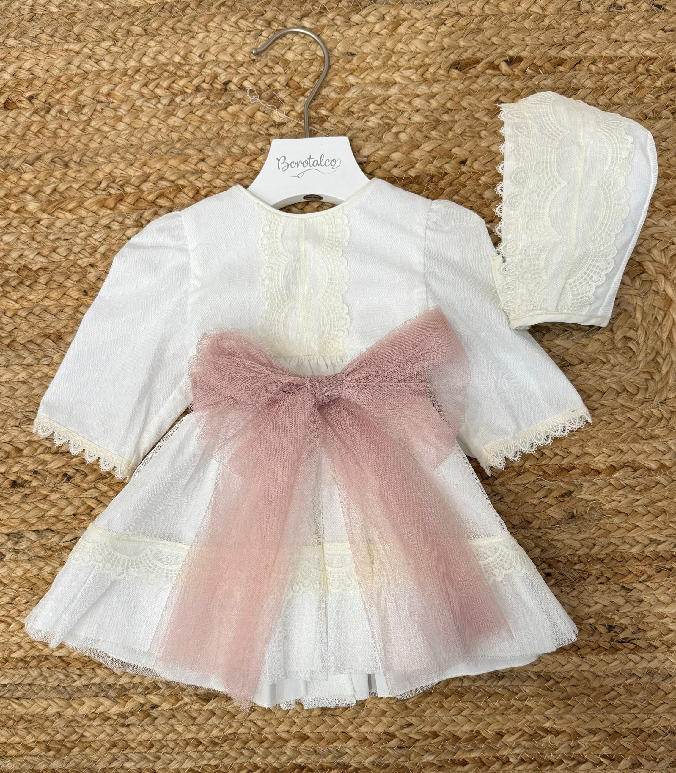 Abito con cuffia in organza con ricami e fiocco in tulle.
