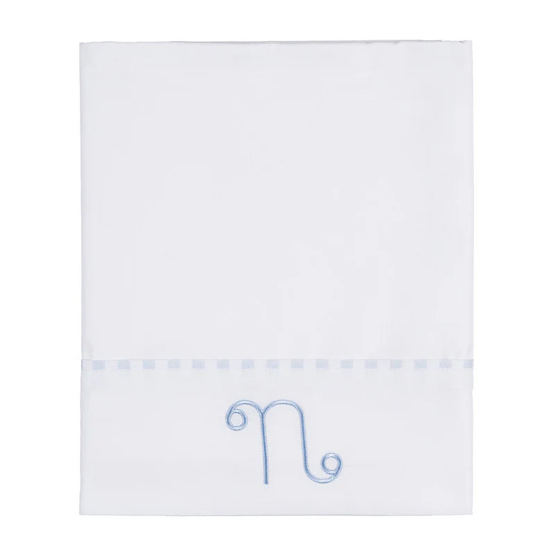 Lenzuolo con piping a righe celeste e dolce ricamo in tono al piping, perfetto per nanne dolci e serene.