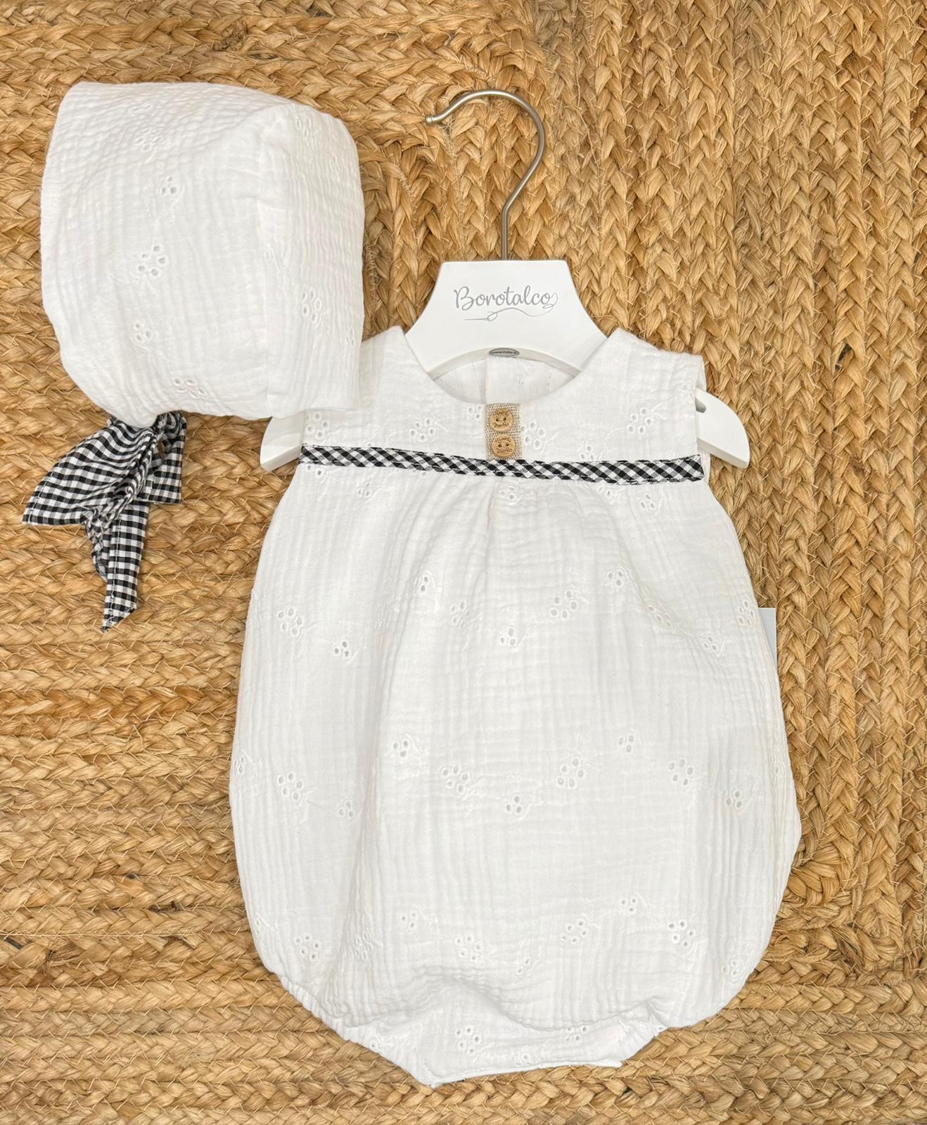 Pagliaccetto con cuffia in sangallo e dettagli a scacchi