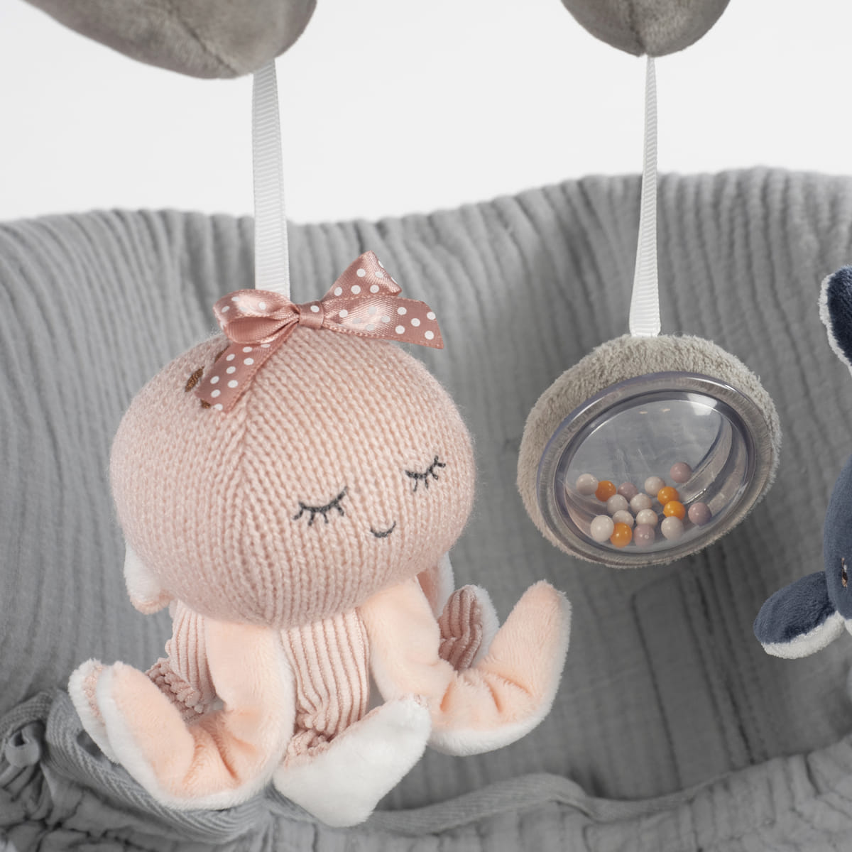 Sonaglio a spirale divertente per passeggino con peluche Octopus Lola rosa e Whale Nico blu. Appositamente progettato per il tempo di gioco del bambino nel passeggino. Realizzato al 90% in poliestere riciclato. Conforme alle normative di sicurezza EN-71 per giocattoli.